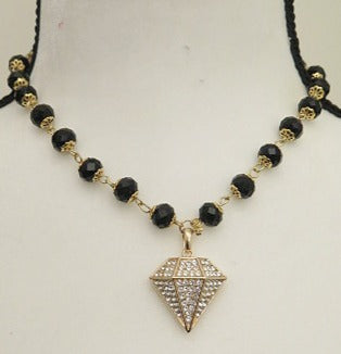 Black Wired Necklace For Women/ Chocker Black Beads Necklace With Sparkling Diamond-shape Pendant/ Black Necklace