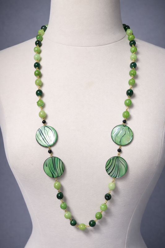 Emerald Green Mixed Bead Long Statement Necklace | 37" Gold Wire Necklace with Hand-Painted Disc Beads & Gold Toggle Clasp for Women