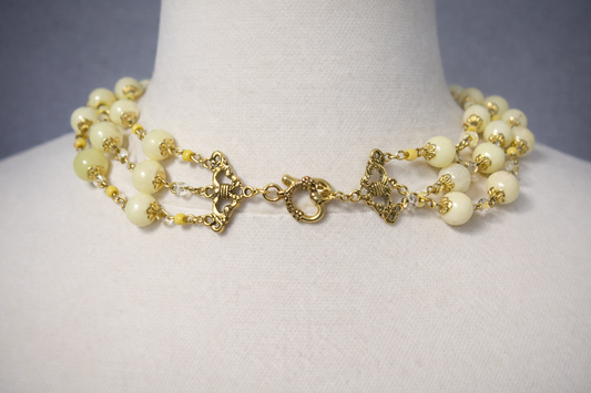 Butter Yellow Triple Strand Beaded Necklace | 20" Handcrafted Gold Wire 3-Layer Bead Necklace with Filigree Connectors & Heart Toggle Clasp