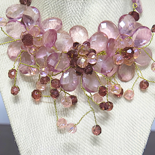 Mauve Purple Crystal Floral Bib Necklace | Handcrafted Gold Wire Twisted Flower Statement Necklace for Women & Special Events