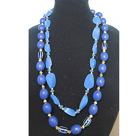 Blue & Gold Double Strand Beaded Statement Necklace | Long Layered Cobalt Blue Chunky Bead Necklace for Women & Special Occasions