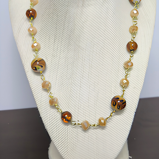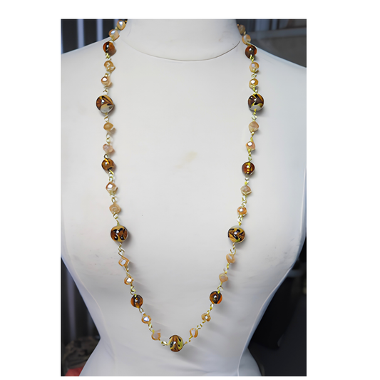Tortoise Shell & Champagne Crystal Beaded Necklace | 30" Gold Wire Statement Necklace for Women, Everyday Wear & Special Occasions