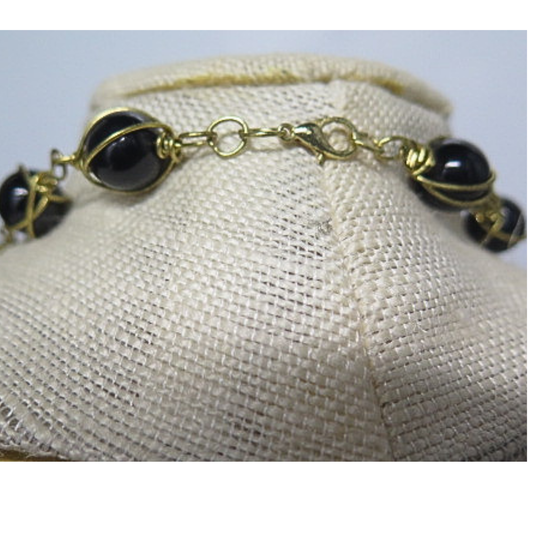 Black Onyx Wire-Wrapped Bead Necklace | 20" Handcrafted Gold Wire Caged 8mm Bead Statement Necklace for Women, Church & Formal Events