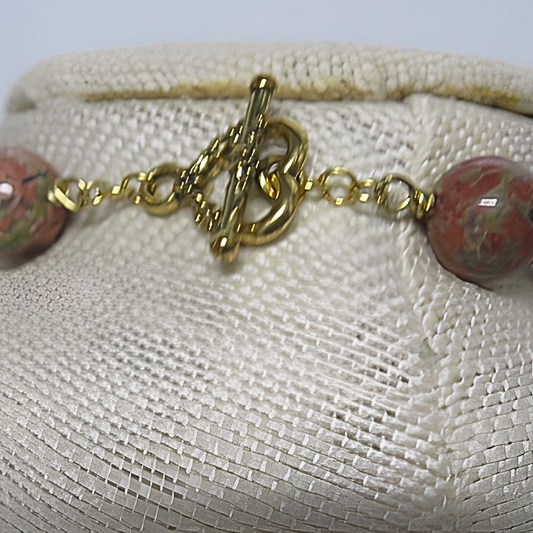 Unakite Stone Fan Bib Necklace | 19" Handcrafted Gold Wire Natural Stone Teardrop Collar Necklace with Toggle Clasp for Women