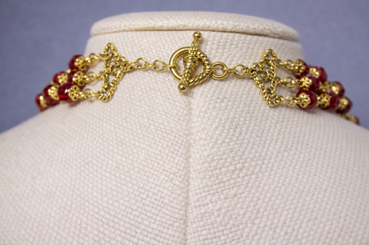 Burgundy Garnet Triple Strand Crystal Necklace | 20" Handcrafted Gold Wire 3-Layer 4mm Bead Collar Necklace with Gold Toggle Clasp for Women