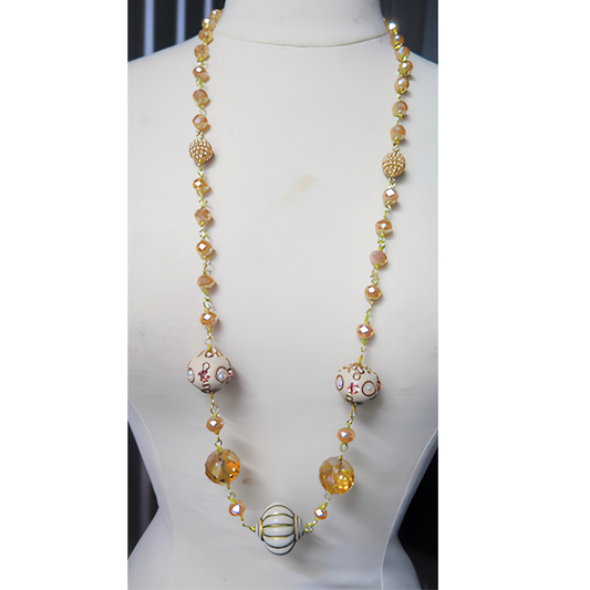Champagne & Ivory Hand-Painted Artisan Bead Long Necklace | 37" Gold Wire Statement Necklace with Crystal & Pave Accents for Women