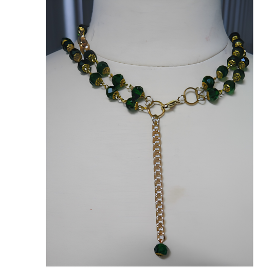 Emerald Green Double Strand Lariat Necklace | 19.5" & 28" Handcrafted Gold Chain Crystal Bead Set with Rhinestone Teardrop Pendant & Chain Drop