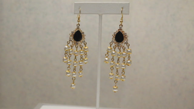 Black and gold elegant earrings handcrafted for special occasions. This piece is made with gold-tone French fish hooks, caps, black and gold connectors, and pearls. It measures 3.8" in length. We have other sillilar items here . We have necklaces that will be perfect for this earring. Also bracelets that can go with it be it charmed bracelets or simple or beads bracelets we have that available. We also have cocktail rings to show your artisan beautiful nails. Designed wallet to make you look wealthy.Also scarves to add class to your outfit. Shop Now
