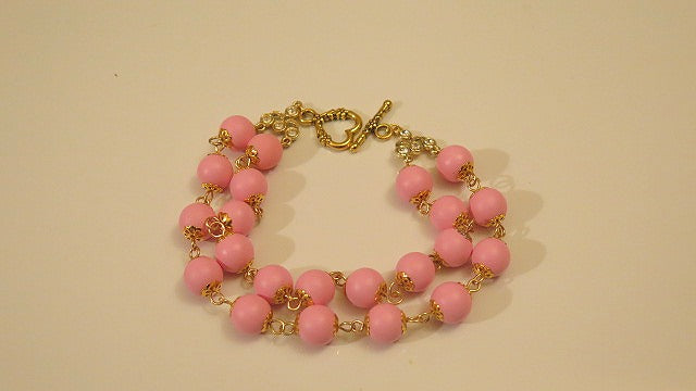 Double pink wired bracelet. This double bracelet is made of 8mm pink beads, gold wire, gold cap and toggle heart-shape closure. This piece measures 9". This braclet just needs to be style alot, you don't need to add another. We also have different bracelets that you can visit our store to check. We also have a variety of necklaces to choose from.
