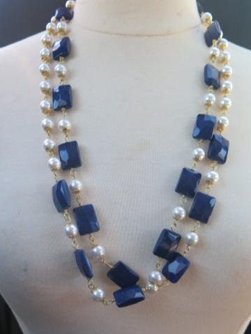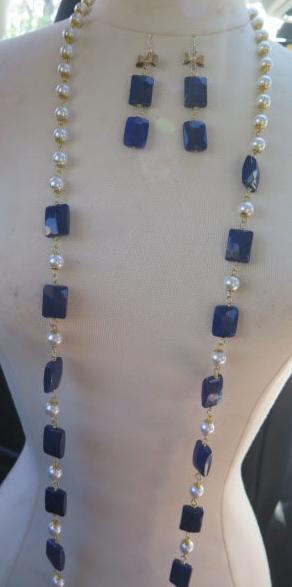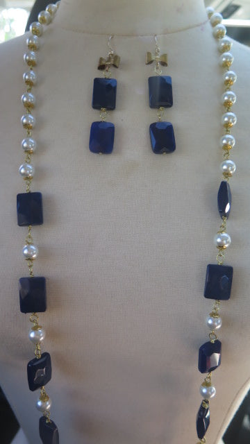 The set includes a 60-inch extra-long necklace, a 9-inch bracelet with a secure lobster closure, and 3-inch drop earrings. Crafted with a combination of luminous pearls and striking square blue beads, this jewelry set is designed to make a bold yet refined statement.