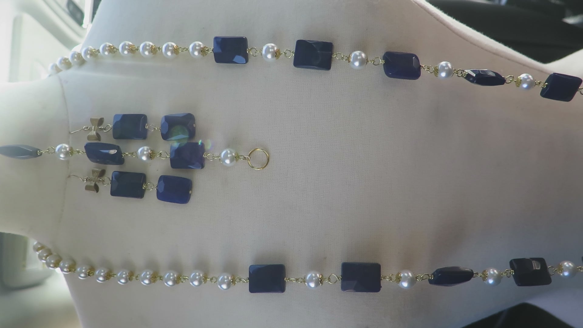 - Design: Three-piece jewelry set featuring pearls and square blue beads for a classic-meets-modern aesthetic.