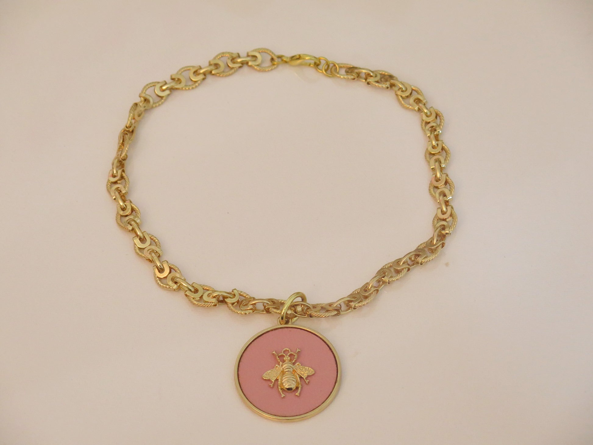 This elegant piece features a shiny 18K gold link chain, paired with a striking large pink and gold bee pendant, making it perfect for a special event. The necklace measures 16.5 inches in length and is secured with a lobster clasp closure.This necklace will be perfect with any of our pink bracelets or pink scarfs or pink hair accessory.