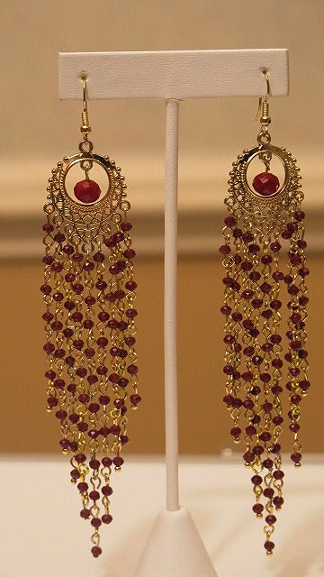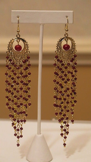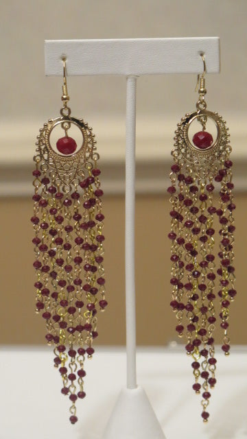 Red long earring, this luxurious piece is design for special events. It is made with brass chandeliere connectors, french fish hook, gold tone wires, 2mm red bicone beads and 8mm red glass beads. It measures 5.5".