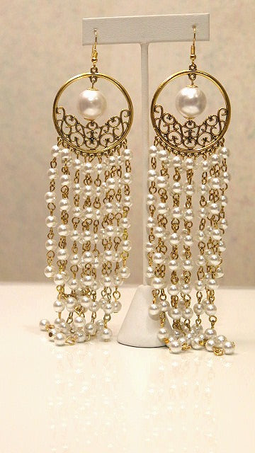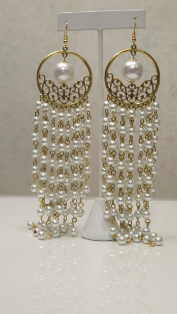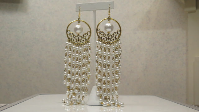 Long Pearl chandelier earrings, this luxurious piece is design for special events. It is made with brass chandeliere connectors, french fish hook, gold tone wires, 2mm pearls and 12mm pearls. It measures 7".