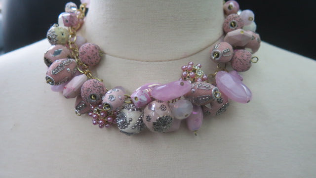 Make a bold and beautiful statement with the Pink Designer Jesse James Cluster Necklace, crafted for those moments when you want to shine. This exquisite necklace features an array of colorful pink beads in various shades and shapes, creating a visually stunning and vibrant cluster design. Each bead is carefully selected to bring out a unique charm that complements your style.
