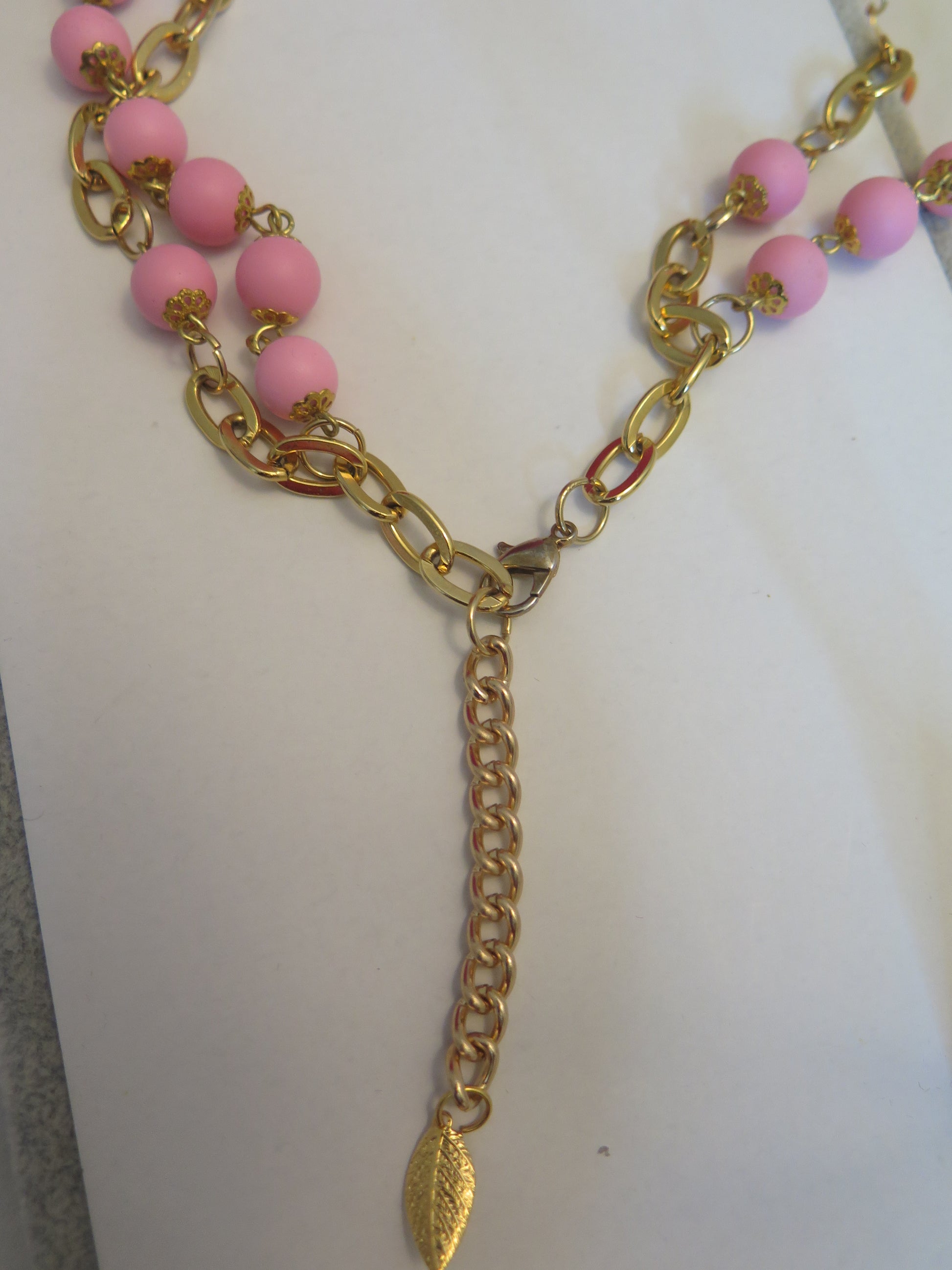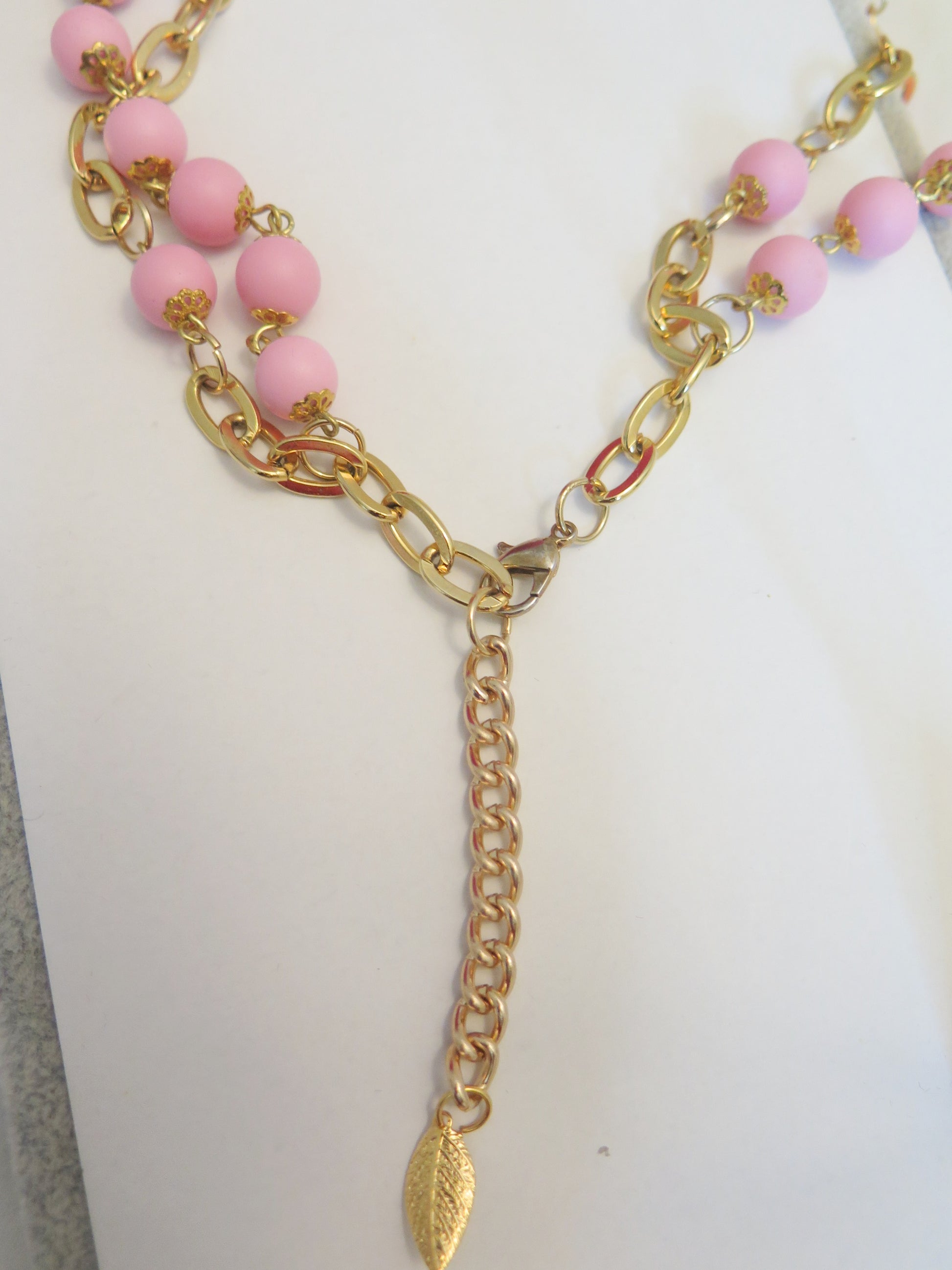Pink Jewelry Set: Double Gold Chain & Beads Necklace with Matching Earrings. Indulge in elegance with this exquisite Pink Jewelry Set, featuring a stunning double gold chain and pink beads necklace paired with matching earrings. This set is designed to capture attention and add a touch of sparkle to your look. The necklace boasts a large rhinestone pendant that glistens with every move, making it the perfect accessory for any occasion.