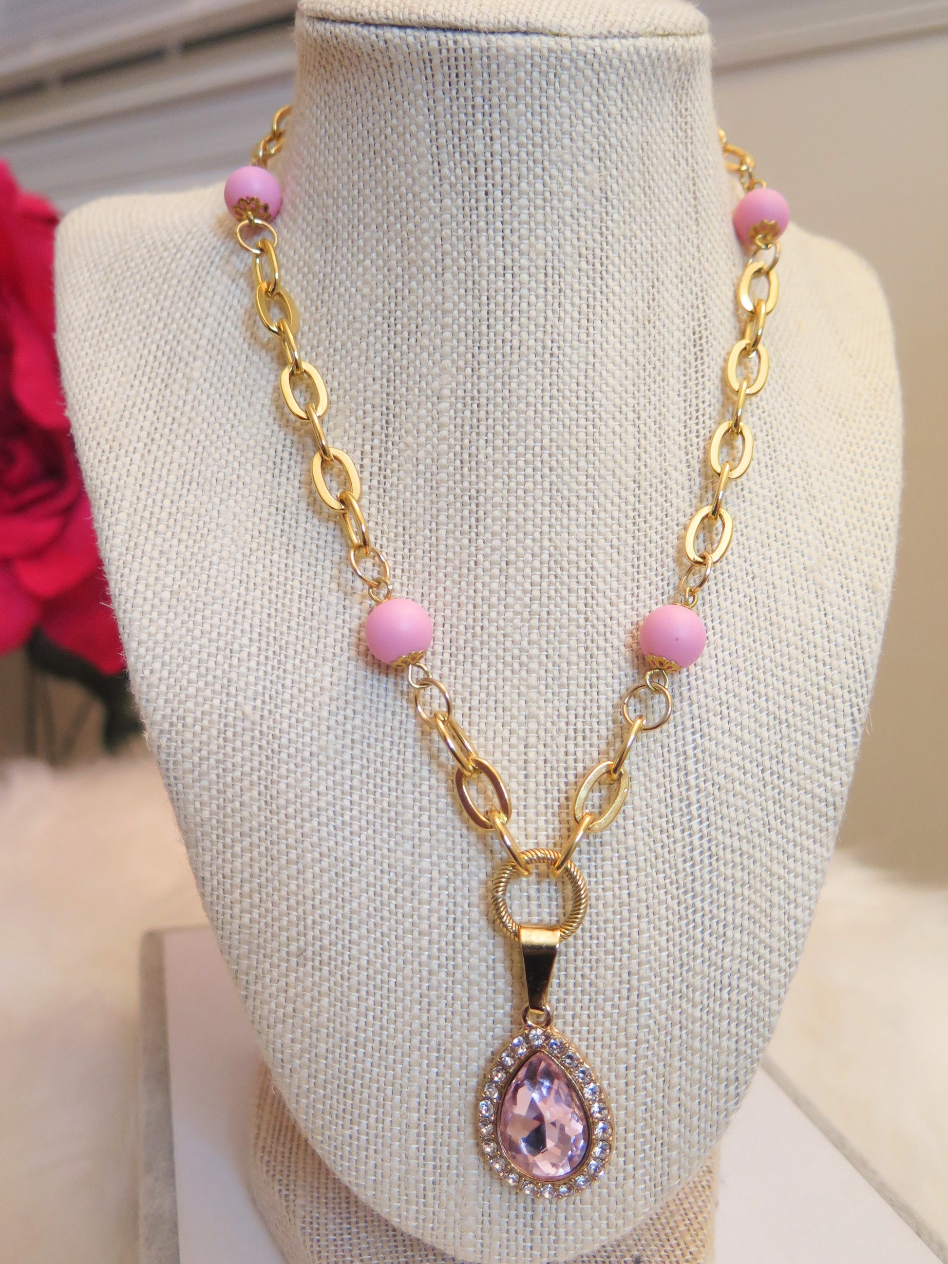 Elevate your style with our exquisite Pink Jewelry Set, featuring a beautifully crafted necklace and matching earrings. The necklace boasts a luxurious 26k gold-plated chain interspersed with delicate pink beads, culminating in a stunning tear-drop-shaped pendant adorned with a sparkling rhinestone. Measuring 17 inches with a 2.5-inch extension, it offers adjustable length for versatile wear and is secured with a lobster closure.