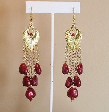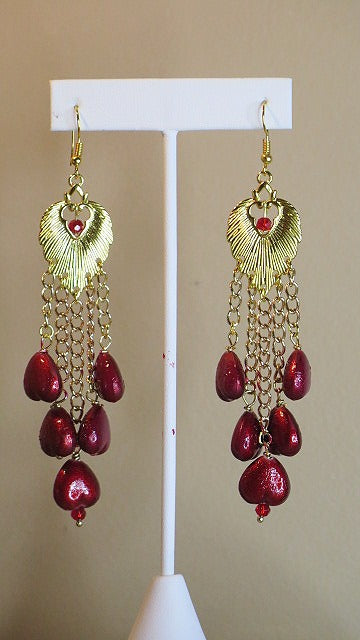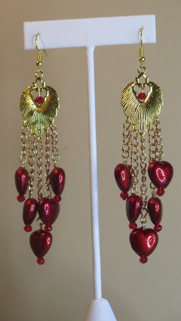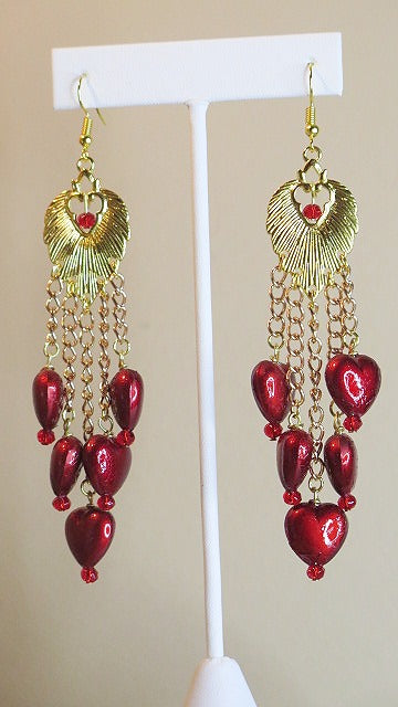 Red earring, an earring designed for a passionate date with someone special. This earring is made with heart shape beads, gold tone earring, gold tone connector and french hook. It measures 4" in length.