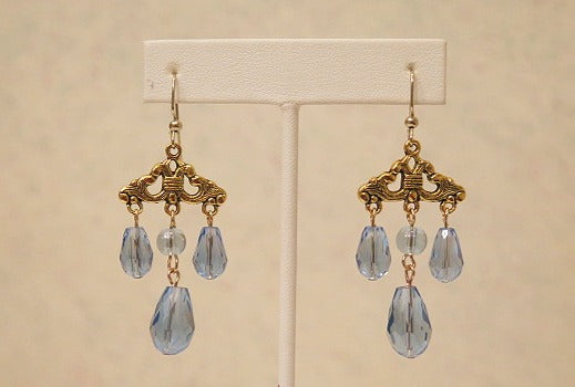 Clear Blue Julliette handmade earring, made with triangle antique gold connectors,gold tone caps, blue glass clear teardrop beads and french fish hook.This handcrafted beauty measures 2.5".