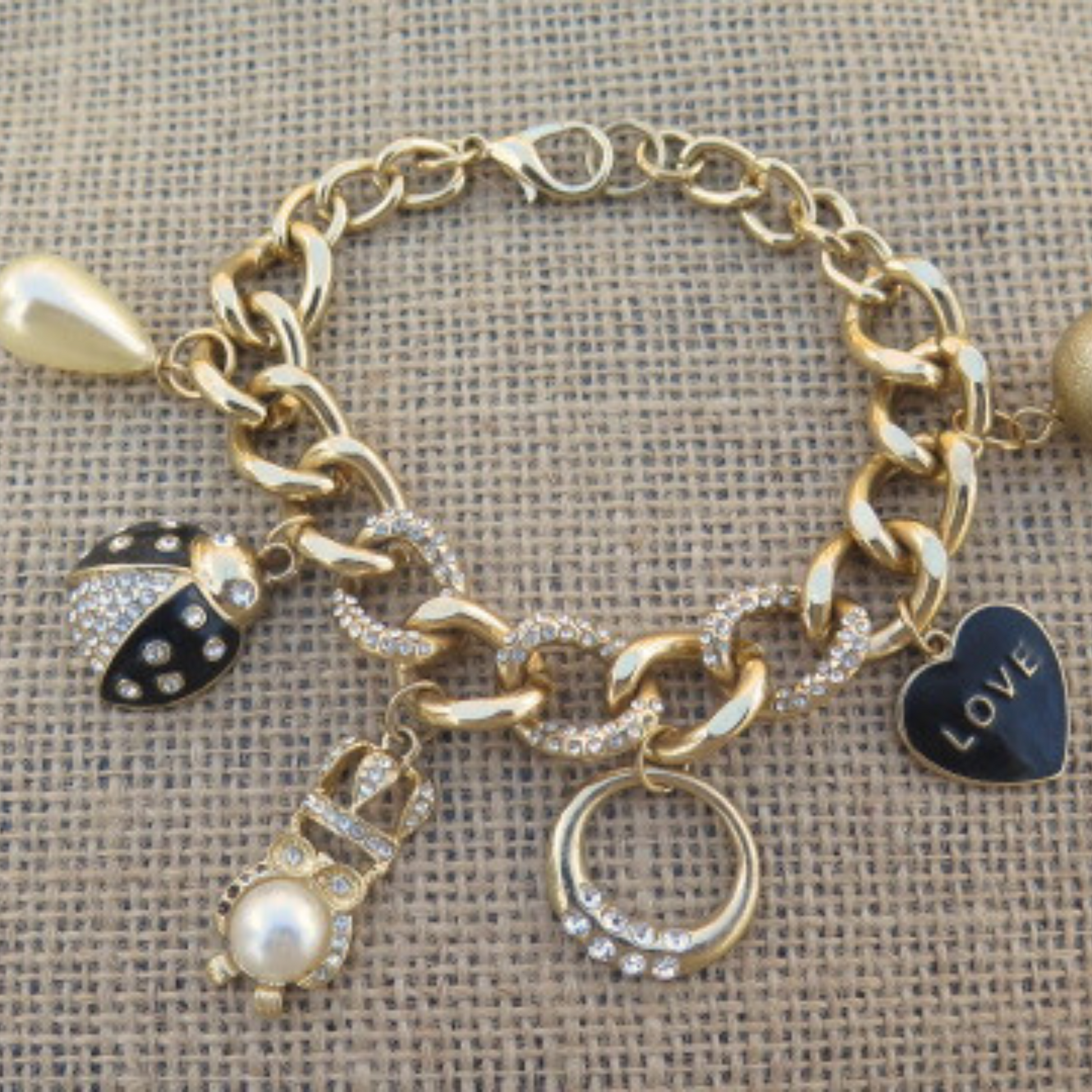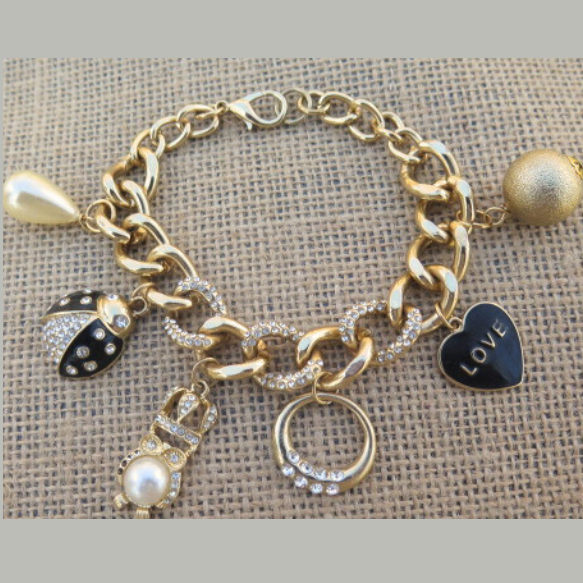 Wrap your wrist in timeless elegance with this radiant Gold Charm Bracelet—a true symbol of sparkle, strength, and beauty. Measuring 9 inches, this bracelet gleams with luxurious gold tones and is adorned with dazzling rhinestones that catch the light like tiny stars. Each charm is thoughtfully placed, glistening with its own rhinestone accents, telling a story of joy, dreams, and unforgettable moments.